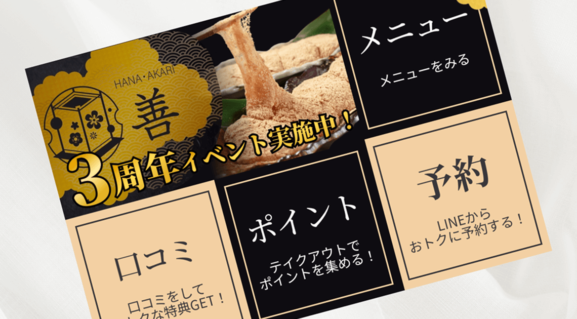 さらに、「3周年」の文字にはロゴと同じ金色を使用。記念の節目にふさわしい華やかさを加えつつ、上品で落ち着いた雰囲気を保つことで、お店の世界観に沿った仕上がりとなっています。